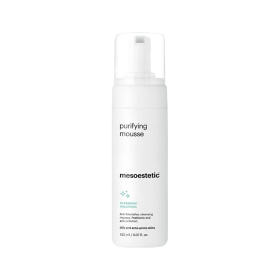 La Purifying Mousse de Mesoestetic es una espuma de higiene diaria diseñada para pieles grasas o con tendencia acneica. Su fórmula avanzada ofrece una limpieza profunda sin resecar, actuando en tres frentes: