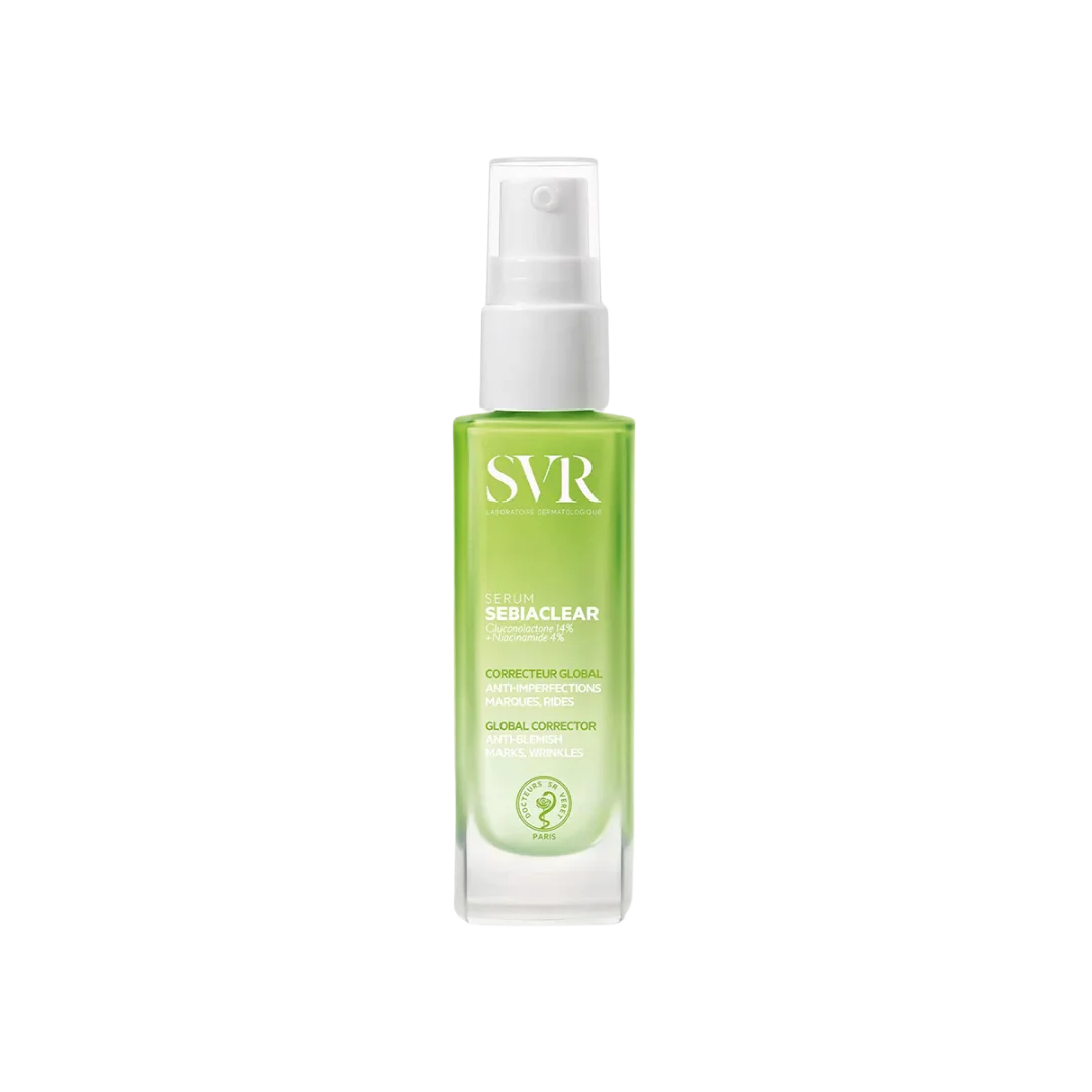 SVR Sebiaclear Serum es un tratamiento dermatológico diseñado para piel adulta con tendencia acneica y signos de la edad. Su fórmula ultra concentrada actúa en imperfecciones, puntos negros, poros dilatados y marcas residuales, al mismo tiempo que suaviza las líneas finas y mejora la textura de la piel.